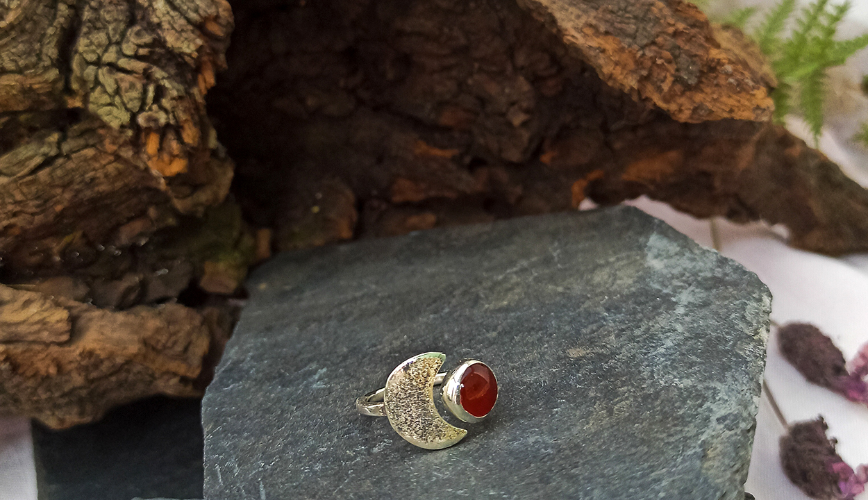 Una de las piezas más llamativas de las creaciones de Atávika es este precioso anillo de la colección Mön que combina la figura de la Luna en plata de ley envejecida y texturizada con una piedra natural a elegir entre diferentes tonalidades: ónix (negro), malaquita (verde), sodalita (azul), ágata cornalina (rojo), amatista (morado) y cuarzo rosa (rosa).